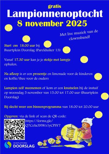 Zaterdag 11 november a.s. is de jaarlijkse lampionnenoptocht georganiseerd door het wijkplatform Doorslag. We starten om 18.00 uur vanaf het buurtplein Doorslag. Vanaf 17.30 uur kun je binnen een stokje met een lampje inclusief batterijen halen. Een lampion kun je zelf komen maken op de kinderinstuif op woensdag 8 november a.s. van 15.00-17.00 uur in Buurtplein Doorslag aan de Parelduiker 13.